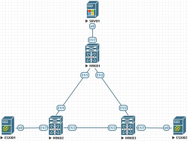In the workshop below, I am trying to show you the different port types with RSTP. I am going to configure the N9K02 and N9K03 E1/7s as spanning-tree port type edge trunk, whereas the E1/7 on N9K01 would be spanning-tree port type edge. I will also configure the inter-switch ports (point-to-point ports) with the port type of network with spanning-tree port type network (which is the default)
