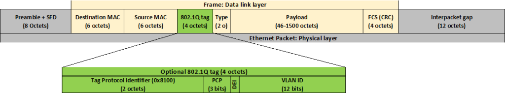 What if we could tag each frame with a VLAN ID on one side, then pass the traffic to another side over a single link or an aggregation of some few links, then the other side could strip that tag? Luckily, we can tag the frames in the switches. The switchport which handles the tagged frames is called a trunk port. On Cisco NX-OS there is only one standard for tagging. That standard is IEEE 802.1Q. With IEEE 802.1Q, we add a 4-byte tag to the header of the frame.